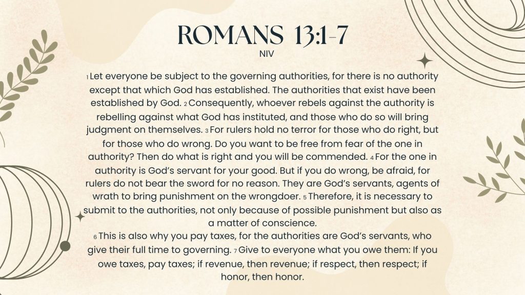 God can and will use anyone he wants to accomplish his purposes, and he always has good in mind (Jeremiah 29:11-12). However, it does not always look how we think it should. Good vs evil is not always a clear distinction for us because we cannot see every little piece of the puzzle like God can. That is why sometimes God allows corrupt people to be in power – to challenge our faith and trust in his sovereignty. This is seen time and time again throughout the Bible. And keep in mind, Paul wrote this passage while under the rule of Nero, who some (myself included) consider to be a mirror of the true anti-Christ to come. Nero was the worst of the worst tyrants, yet Paul still told the Christians in Rome to acknowledge his authority.